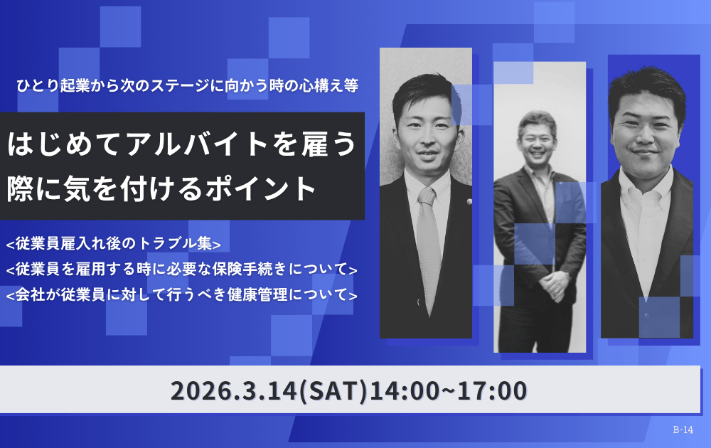 本講座では社労士、労働法に強い弁護士といった労務の専門家を交え、人を雇うときに生じるリスクやその対応について各専門家の視点からお話します。